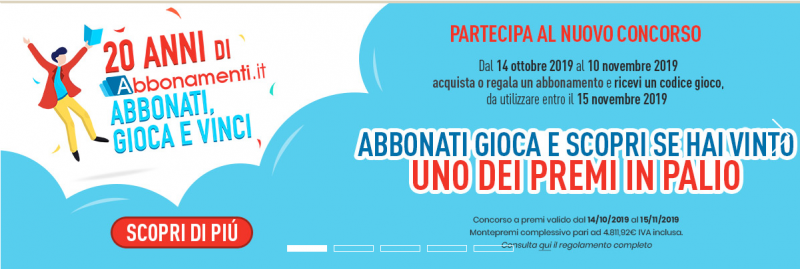 Per Abbonamenti.it questo è un'anno speciale, infatti l'azienda compie 20 anni. Per questo motivo ha deciso di festeggiare, premiando tutti coloro che acquistano o regalano un abbonamento con un fantastico concorso. Effettuando un'acquisto, l'azienda erogherà al cliente tramite e-mail un codice gioco da utilizzare entro il 15 Novembre, il quale consente di avere accesso ad un'innumerevole quantità di premi tra cui: buoni per l'acquisto delle migliori riviste disponibili sull' e-commerce aziendale, macchinette del caffè Nespresso con cialde e carnet per l'entrata nei migliori parchi divetimenti d'Italia. Una fantastica opportunità da non farsi sfuggire. Il concorso è valido dal 14 Ottobre 2019 al 10 Novembre 2019. Sul sito internet www.abbonamenti.it, è possibile scaricare l'intero regolamento, riportante tutti i premi in palio e tutte le condizioni per il gioco. Abbonarsi ad abbonamenti.it quest'anno non è mai stato così vantaggioso per i clienti dell'azienda. Un'occasione da non farsi sfuggire.