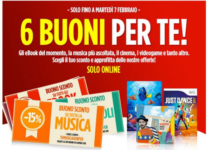 Codice Sconto MUSICA: con il codice sconto per il tuo acquisto di articoli della Categoria Musica risparmi il 15% su un carrello di almeno 30 euro (coupon "15MUSICAGENFEB");