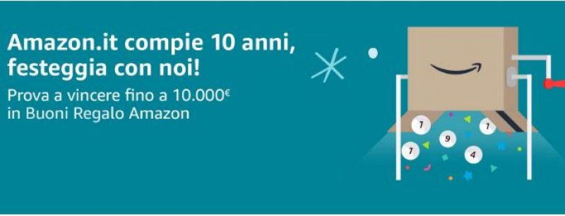 Il colosso degli e-commerce Amazon compie 10 anni, e vuole festeggiare in grande coinvolgendo tutti i suoi amati clienti. Con un ordine di almeno 30 euro sarà possibile vincere fino a 10.000 euro in buoni regalo spendibili su Amazon, senza nessun vincolo! I buoni saranno disponibili nei valori di 100 euro, 1.000 euro e 10.000 euro. Ora vi starete chiedendo: come si può partecipare? Niente di più semplice!