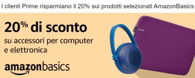 Sconto del 20% sui prodotti Amazon Basic: tra i prodotti Amazon Basic tantissimi sono gli articoli per la camera da letto e il bagno, gli accessori per computer e l'elettronica; gli accessori da viaggio e gli zaini |