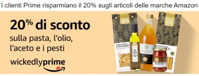 Sconto del 20% su Alimentari e prodotti di marca Amazon con WickedlyPrime: aggiungi direttaemente al carrello tante eccellenze alimentari come la pasta IGP, i pesti (pesto tradizionale, pesto di ricotta e noci, pesto di pomodori secchi), le conserve, gli oli EVO e le conserve. |