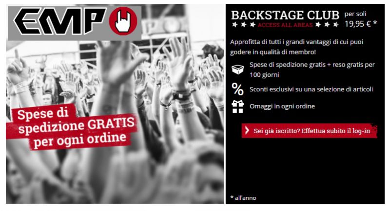 Tutti gli iscritti al Backstage Club EMP non pagano le spese di spedizione: la consegna è gratuita su ordini di ogni importo. Chi invece acquista su EMP senza essere iscritto al Backstage Club deve invece raggiungere la soglia di spesa di 75 euro per azzerare i costi di consegna.