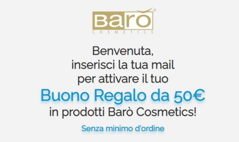 Barò Cosmetics vuole far conoscere i propri prodotti, innovativi e di assoluta qualità. Proprio per questo motivo, dà la possibilità di utilizzare una gift card da 50€, pensato per far testare ai clienti le peculiarità di Barò Cosmetics. Molti sono i prodotti ideati per migliorare l'aspetto e l'elasticità della pelle, grazie alla sua formula innovativa e contenente uva biologica. L'ordine si può effettuare con facilità e non è prevista una tariffa minima per poter effettuare l'ordine. Molti sono i clienti entusiasti dei trattamenti proposti: apprezzano particolarmente la crema anti età e per contorno occhi, ma anche il gel per le gambe, sieri e la splendida maschera viso.