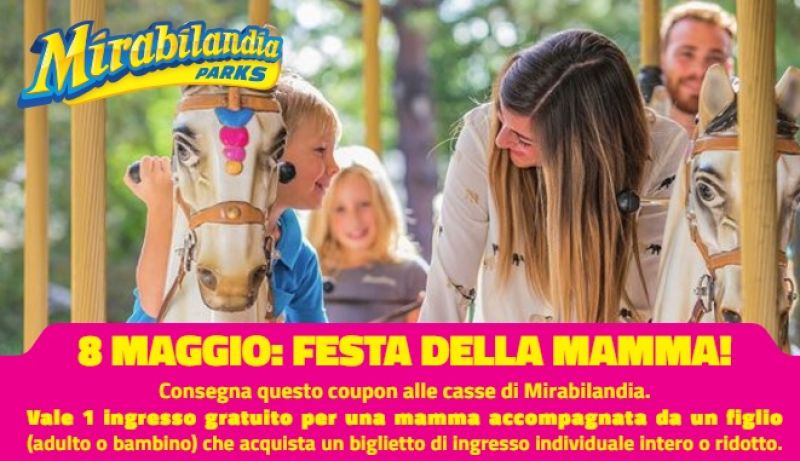 Ecco nel dettaglio come funziona la promozione Mirabilandia: l'8 maggio, tutte le mamme accompagnate da un figlio (grande o piccolo che sia :) ) potranno entrare gratuitamente nel Parco divertimenti di Ravenna. Per ricevere l'ingresso omaggio a Mirabilandia è sufficiente collegarsi a questo indirizzo e scaricare gratuitamente il coupon da presentare alle casse all'ingresso del Grande Parco Divertimenti.