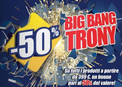 La promozione Trony Big Bang è valida solo in alcune regioni (Puglia, Basilicata, Campania, Liguria, Veneto, Piemonte, Lombardia, Valle d’Aosta), il coupon va utilizzato in un unico acquisto e non dà diritto a resto. Trovi il regolamento completo all'ultima pagina del volantino.
