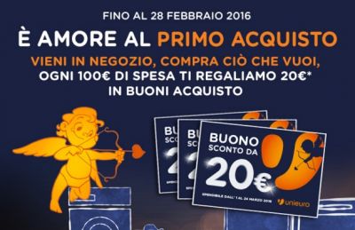 • Buoni spesa da 20 euro ogni 100 euro spesi: questa è la promozione valida solo per gli acquisti fatti nei punti vendita Unieruo fisici. Ogni 100 euro di spesa si Unieuro ti regala un buono acquisto da 20 euro. Questa iniziativa è valida fino al 28 febbraio 2016: la spesa di 100 euro per ricevere il buono sconto Unieuro da 20 euro è libera e riguarda qualsiasi categoria di prodotto, ad esclusione di servizi e ricariche, estensioni di garanzia e carte prepagate. I Buoni Spesa Unieuro guadagnati saranno poi spendibili a partire dal 1 marzo per acquisti di ogni tipo e di ogni importo (basta che la cifra spesa raggiunga perlomeno il valore del buono). Trovi tutti i buoni Unieuro e le promozioni attive a questa pagina.