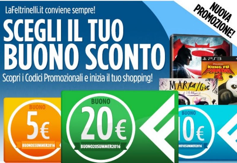 Dopo qualche settimana di assenza e di saldi su migliaia di titoli del catalogo online, tornano disponibili i buoni sconto La Feltrinelli per risparmiare sull'acquisto dei vari prodotti multimediali: film in dvd e Blu ray, cd e musica, videogames, giochi e idee regalo. Trovi tutti i coupon disponibili oggi e i codici sconto La Feltrinelli futuri non appena saranno disponibili a questa pagina.
