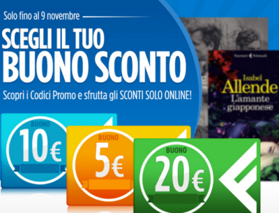 Infatti questi codici sono validi solo per pochi giorni, dal 4 al 9 novembre 2015. Trovi i tre buoni e le nuove offerte della libreria online a questa pagina.