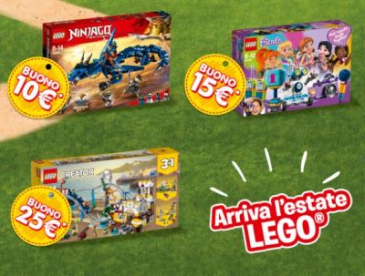 Arriva l'estate LEGO: acquista entro il 25 giugno uno dei prodotti LEGO in promozione a questa pagina e ricevi un buono sconto di valore indicato da spendere su un nuovo acquisto. L'importo del buono sconto LEGO è variabile: si va dai coupon di 10 euro fino a buoni sconto da 25 euro. Inoltre tutti i prodotti LEGO della promozione sono già in offertta su Coop Online. Trovi questa e tutte le altre offerte Coop Online attive al momento alla pagina Buoni Sconto Coop.