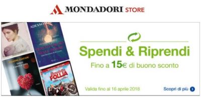 L'offerta Spendi & Riprendi Mondadori Store è valida dal 9 al 16 aprile 2018 (l'offerta è stata prorogata fino al 19 aprile 2018!): il codice ti verrà inviato successivamente alla data di scadenza di questa promozione, direttamente all'indirizzo mail legato al tuo account. Il buono Mondadori guadagnato sarà spendibile su un acquisto nel mese di maggio (dal 01/05/18 al 31/05/18).