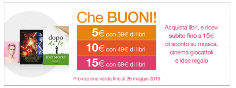 Ottieni uno sconto di 5 euro, 10 euro oppure 15 euro in base alla spesa di libri del tuo carrello, sconto applicabile sugli articoli delle Categorie Musica, Cinema, Idee Regalo e Videogames.