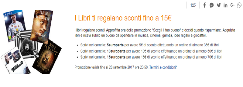 Non occore specificare che acquistando di più avrai anche un risparmio maggiore su altri prodotti. Questa promozione rimane valida fino a giovedì 28 Settembre, alle ore 23,59. Per usufruire di questi coupon basta raggiungere la spesa di soglia aggiungendo libri italiani, professionali e scolastici, esclusi gli eBook, libri in lingue straniere e il Book on demand. Una volta fatto ciò potrai aggiungere prodotti dalle categorie musica, cinema, videogiochi, idee regalo e giocattoli, per poi inserire il codice sconto appropriato. Lo sconto si applica solo sugli articoli di quest'ultime categorie e non sui libri, quindi conviene fare attenzione che la spesa di quest'ultimi articoli sia superiore o pari al valore del buono sconto.