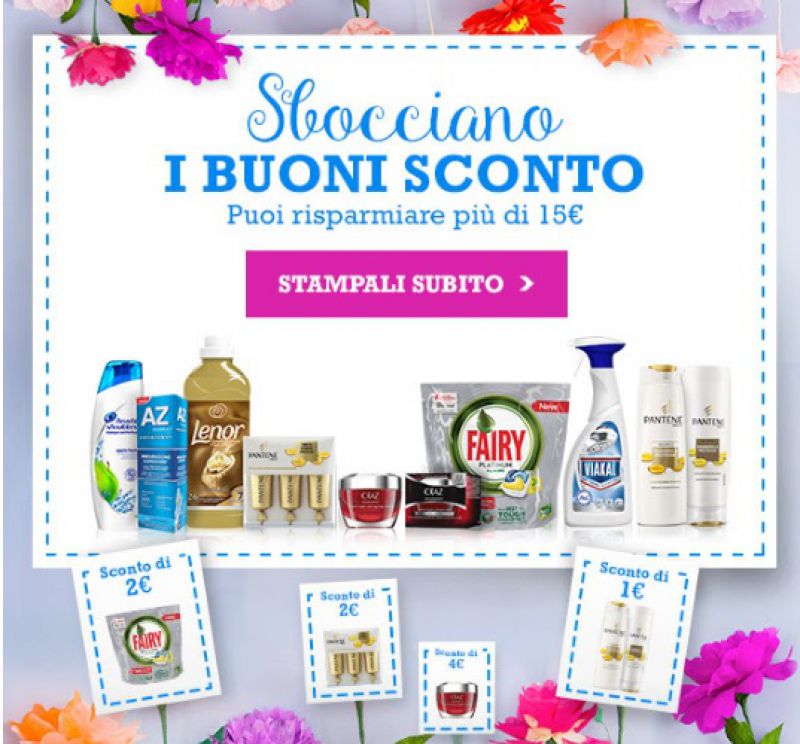 Dopo gli ultimi coupon da stampare per gli acquisti al supermercato, segnaliamo oggi i nuovi Coupon "Sbocciano i Buoni Sconto". Sono ora online i nuovi buoni sconto di primavera Desideri Magazine, pronti da stampare per risparmiare fino a 15 euro sui prodotti P&G che ami di più e che usi più spesso. Per scaricare i coupon, effettua il login al portale Desideri Magazine e segui la procedura di scaricarli correttamente. Ecco i buoni Sconto Immediati da stampare (a colori, mi raccomando!), a partire dai più convenienti:
