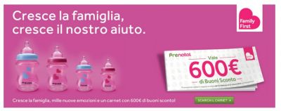 Non è la prima volta che Prenatal offre un Carnet di Buoni Sconto così ben fornito, avevamo già incontrato una promozione simile l'anno scorso con il nome di Prenatal Loves Family: questa volta la promozione Prenatal che ti offre 600 euro in buoni sconto si chiama "Family First", è attiva dal 25 febbraio 2016, e sarà valida per tutto il mese di marzo, fino al 21/03.
