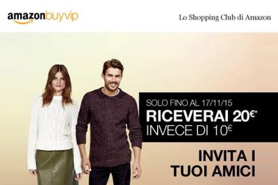 Per ogni amico che si inscriverà e che farà il suo primo acquisto tu riceverai un buono sconto di 20€ da spendere sul tuo prossimo ordine. Di solito la ricompensa per aver invitato un amico su AmazonBuyVip è di 10 euro, solo fino al 17 novembre 2015 il buono sconto è raddoppiato e per ogni amico guadagni 20 euro!