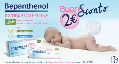 Per ricevere il tuo codice sconto ti basta collegarti al portale Bepanthenol dedicato alle mamme, dove puoi trovare tante offerte e novità, alla pagina appositamente dedicata: trovi il tuo coupon in formato PDF cliccando qui. Ora stampa semplicemente il tuo buono sconto e presentalo alla cassa insieme al tuo prossimo acquisto di una confezione di Bepanthenol Extra Protezione. La promozione è valida fino al 30 ottobre 2015. Il buono sconto Bepanthenol non è cumulabile, però puoi stampare tutte le copie che ti sono necessarie per i tuoi acquisti, da effettuarsi ovviamente entro la data di scadenza segnalata.