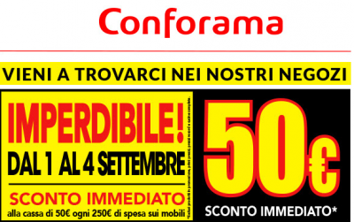 Si tratta di un nuovo buono sconto Conforama da 50 euro disponibile per chi sceglierà di acquistare in negozio nel periodo compreso tra il 1° e il 4 settembre 2017.