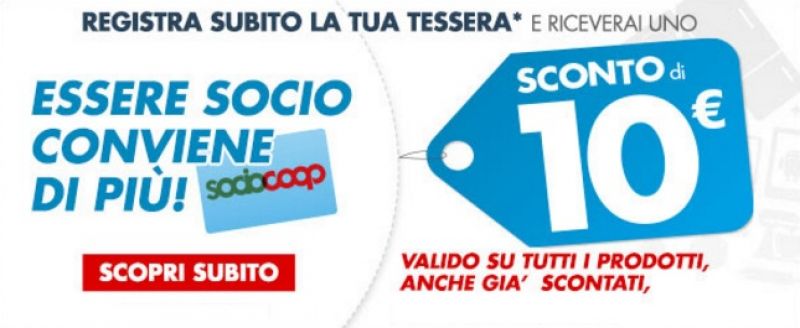 Sei solito fare la spesa alla Coop? Allora di certo non ti manca la Tessera Socio Coop che ti permette di accumulare punti e di ottenere esclusivi sconti nel tuo supermercato di fiducia. Oggi essere Socio Coop ti conviene per un motivo in più: infatti grazie alla tua tessera coop, potrai ottenere 10€ di buono sconto Coop Online.