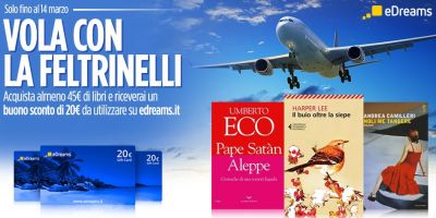 Alla promozione Mondadori che ti offre Buoni Sconto per acquistare Musica, di cui abbiamo parlato in un precedente articolo, La Feltrinelli risponde con un Buono sconto eDreams da 20€ con un acquisto di libri di 45 euro, con la promozione "Vola con la Feltrinelli".