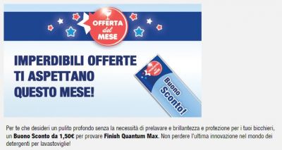 Finish è un'altra azienda che dà la possibilità ai clienti di scaricare da internet i coupon da utilizzare sui suoi prodotti. La promo di questo mese ti offre un buono sconto da 1,5€ per Finish Quantum Max, l'ultima idea Finish nel campo dei detergenti per lavastoviglie.