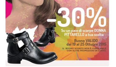 Dopo la promozione sulle scarpe da ginnastica e quella sulle scarpe da Bambino Pittarello torna con una nuova interessante offerta: il nuovo buono sconto Pittarello del 30% è valido su un acquisto di scarpe da Donna a tua scelta! L'offerta dura solo pochi giorni: potrai usare il tuo buono sconto solo nei giorni compresi tra il 19 e il 25 ottobre 2015. Puoi scoprire il BUONO SCONTO Pittarello più recente alla pagina aggiornata.
