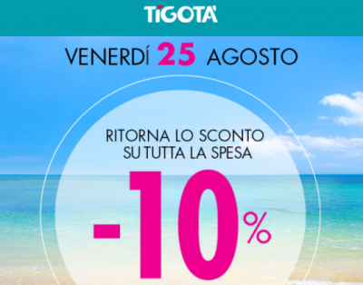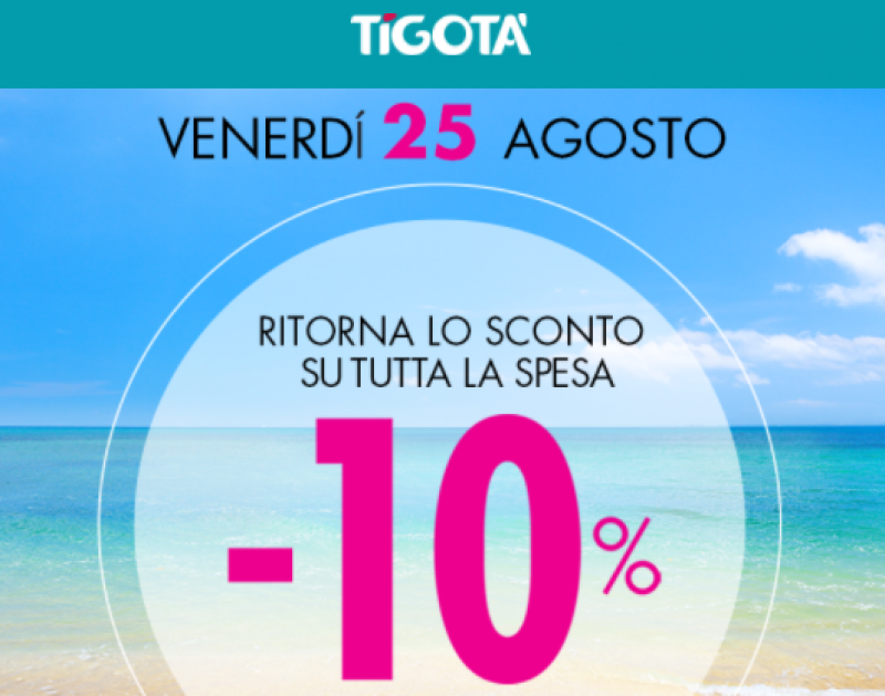 Tigotà ti offre un buono sconto del 10% sull'intera spesa, ma attenzione, perché l'offerta sarà valida solo domani, 25 agosto 2017. La promo Tigotà "riitorna lo sconto sulla spesa" è valida per tutti i possessori di Fidelity Card Tigotà, sia online, sia in negozio.