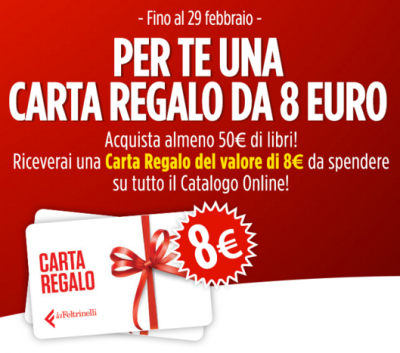 E' tornata infatti la promozione La Feltrinelli che ti offre una Carta Regalo del valore di 8 euro con l'acquisto di un almeno 50 euro di libri. Questa volta l'offerta è valida dal 24 al 29 febbraio: se vuoi ricevere la tua Carta Regalo non ti resta che andare sul sito e cominciare a riempire il tuo carrello: infatti la promozione La Feltrinelli è valida solo online e non nelle librerie fisiche del gruppo.