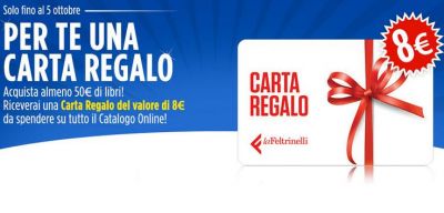 E' tornata la Promozione LaFeltrinelli che ti regala una Carta Regalo del valore di 8 euro con il tuo acquisto di libri sul sito! Trovi questa e le altre offerte e gli altri sconti La Feltrinelli aggiornati a questa pagina dei buoni sconto.