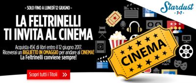 Si tratta della nuova promozione La Feltrinelli che offre un Ingresso al Cinema in Omaggio a tutti coloro che effettueranno un acquisto online entro il 12 giugno 2017. Ecco tutti i dettagli: per ottenere l'ingresso omaggio al cinema è necessario effettuare un acquisto online di libri nello store La Feltrinelli per almeno 45 euro entro la data segnalata. Con la conferma dell'ordine si riceverà un codice univoco che permetterà di ottenere un voucher digitale “Stardust® 1+1”: si tratta di un buono per un ingresso omaggio al cinema a fronte di un biglietto pagante tariffa intera.