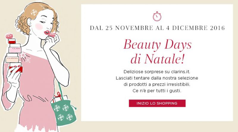 In mezzo a tutte queste offerte, per esempio, si distingue la Promozione Clarins Beauty Days: durante tutto il periodo dei Beauty Days Clarins è previsto uno Sconto speciale su tutti gli ordini online: dal 25 novembre al 4 dicembre, tutti coloro che acquisteranno online nello shop Clarins avranno uno Sconto del 20% su tutti i prodotti, su tutti gli ordini di qualsiasi importo!