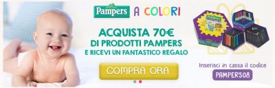 Si tratta della scatola di Colori Pampers, che verrà aggiunta gratuitamente ad ogni ordine di almeno 70 euro di prodotti Pampers su Mukako. Puoi acquistare quello che vuoi, tra pannolini, pannolini costumino, pannolini mutandino, salviettine e teli, purché si tratti di prodotti a marchio Pampers acquistati in un unico ordine su MUKAKO. La soglia di spesa minima richiesta per aggiungere i colori in omaggio al tuo ordine è di 70 euro. L'offerta è valida dal 20 agosto fino al 9 settembre 2018.