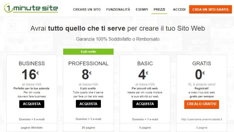 1minutesite offre tante soluzioni per la creazione di siti web per ogni esigenza: dalla versione basic assolutamente gratuita, fino ad arrivare alla soluzione business, perfetta per chi ha un'azienda e ha necessità di costruire il proprio e-commerce o creare il proprio sito web con dominio personalizzato, mail collegate e pagine illimitate.