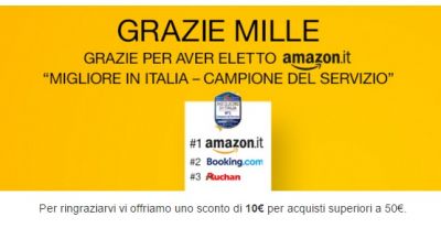 I consumatori italiani hanno eletto Amazon "Campione in Italia- Migliore del Servizio, secondo il sondaggio condotto dall'’Istituto Tedesco di Qualità e Finanza ad ottobre. E proprio in occasione di questo successo, Amazon ha riservato un codice sconto speciale ai proprio utenti: si tratta di un codice sconto di 10 euro su una spesa superiore ai 50 euro, eccezionalmente valido nella sola giornata di oggi, venerdì 13 novembre 2015!