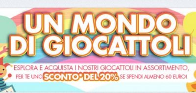 Nello specifico, il codice sconto Coop in questione ti permette, acquistando uno o più giocattoli del catalogo online, di ricevere il 20% di sconto sul tuo carrello di acquisti, se il tuo carrello raggiunge la soglia minima di 60 euro.