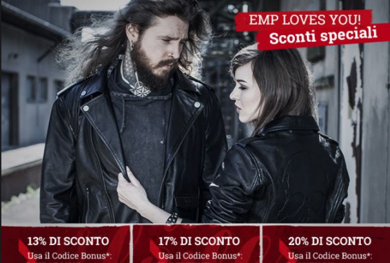I Coupon sconto EMP di San Valentino sono 3, uno per uno sconto del 13% su un acquisto minimo di 59 euro nello store online (il codice da inserire è MYDARLING ); il secondo per una riduzione del 17% su un carrello di almeno 79 euro (codice VALENTINE ) e infine un buono sconto per una riduzione del 20% su un carrello di almeno 99 euro (il codice da inserire è ILOVEYOU) . Attenzione: i codici sconto sono validi su quasi tutto l'assortimento ma non possono essere utilizzati su una selezione di prodotti Top Seller. Potrai verificare se il prodotto è incluso nella promozione direttamente dal carrello, dopo aver inserito il codice bonus. Puoi utilizzarlo sui prodotti che preferisci tra tutti il merchendise della più celebri band rock e metal, abbigliamento gothic, accessori e gadget di ogni tipo.