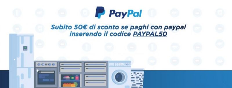 Con questo codice sconto infatti, ricevi uno sconto di ben 50 euro sul tuo carrello di elettrodomestici, rispettando le specifiche condizioni: prima di tutto il pagamento deve essere effettuato con Paypal, mentre non sarà possibile utilizzare il codice sconto per un pagamento differente, con carta di credito o bonifico che sia.