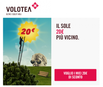 Ecco la nuova promozione Volotea che ti permette di prenotare il tuo prossimo volo a prezzo scontato. Dopo la promozione della precedente settimana, in cui Volotea inaugurava 22 nuove rotte proponendo voli a soli 5 euro a tratta, l'offerta di questa settimana è un codice sconto del valore di 20 euro, da applicare sul volo di tuo interesse.