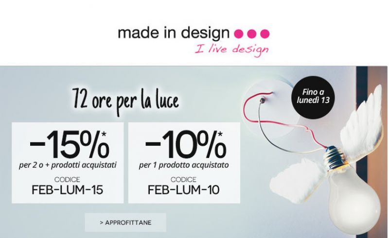Fino domenica potrai infatti acquitare un articolo qualsiasi con uno sconto del 10% (utilizzando nell'apposito spazio del carrello sul sito MadeinDesign il codice FEB-LUM-10): non c'è necessità di raggiungere alcuna spesa minima per applicare il coupon.