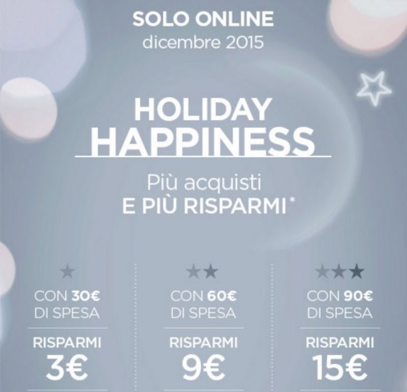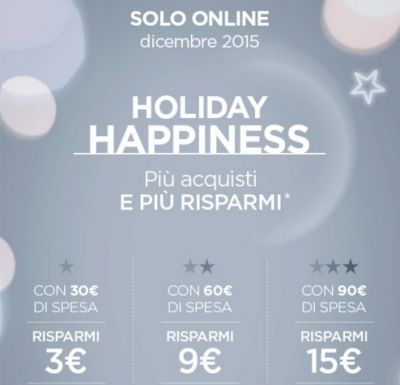 Con la promozione Holiday Happiness Più acquisti più risparmi: infatti puoi risparmiare 3 euro su una spesa di almeno 30 euro con il codice KIKO dedicato; riceve un buono sconto di 9 euro su una spesa di almeno 60 euro, fino ad un buono sconto di 15 euro su un carrello degli acquisti Kiko di almeno 90 euro. Preleva subito a questa pagina il codice sconto KIKO Milano giusto per il tuo acquisto, tra i 3 a disposizione.
