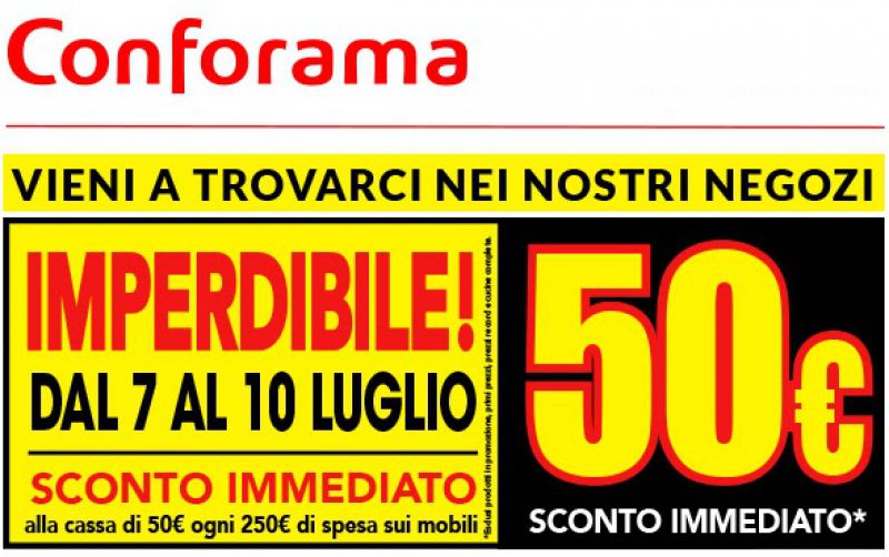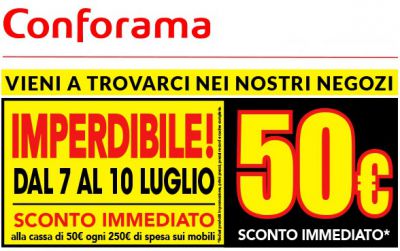 Se devi acquistare mobili e complementi d'arredo da Conforama, non perdere questo sconto di 50 euro che ti aspetta per gli acquisti fino al 10 luglio! Si tratta di un buono sconto immediato di 50 euro che ti verrà sottratto direttamente in cassa su ogni spesa di almeno 250 euro. Il buono sconto Conforama da 50 euro è valido sugli acquisti effettuati tra il 7 e il 10 luglio 2017. La promozione è valida solo nei punti vendita, e non nel negozio online. Se preferisci acquistare mobili e arredamento online, non perderti i negozi di arredamento che offrono codici sconto.