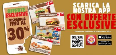 Questi coupon Burger King sono validi fino al 16 novembre 2015 in tutti i ristoranti che aderiscono all'iniziativa. Puoi stamparne quanti ne vuoi, o – se preferisci- puoi scaricare direttamente la App per smartphone, così da avere i migliori sconti per hamburger e patatine sempre con te, senza necessità di stamparli su carta!