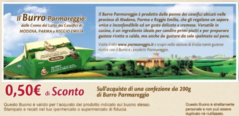 Dopo l'ultimo coupon di casa Parmareggio che avevamo pubblicato, cioè il buono sconto per Parmareggio Petali di Parma, ecco la new entry da stampare: il buono sconto Burro Parmareggio da 0,50 €.
