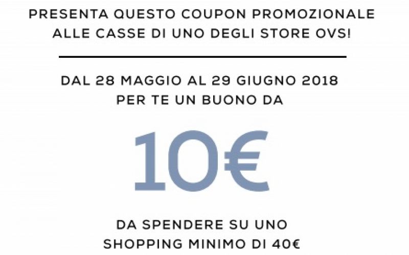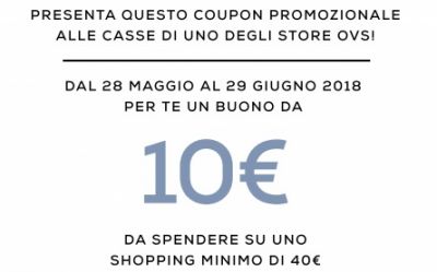 Sul sito OVS è disponibile un nuovo buono Sconto da scaricare, utilizzabile negli stores dal 28 maggio fino al 29 giugno, valido per gli acquisti in store e non per gli acquisti online.