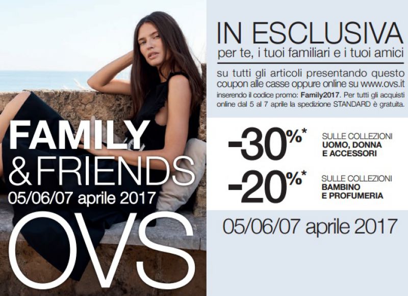 Se invece preferisci acquistare direttamente in negozio, scarica il buono sconto OVS direttamente a questo link e portalo con te nel negozio OVS più vicino. La promozione è valida in tutti i punti vendita OVS aderenti, chiedi conferma al personale del tuo punto vendita. Il coupon è utilizzabile su tutto l'assortimento ad esclusione di alcuni specifici marchi e sui prodotti già in promozione. Lo sconto Family & Friends OVS 2017 è valido solo per tre giorni: dal 5 al 7 aprile 2017.