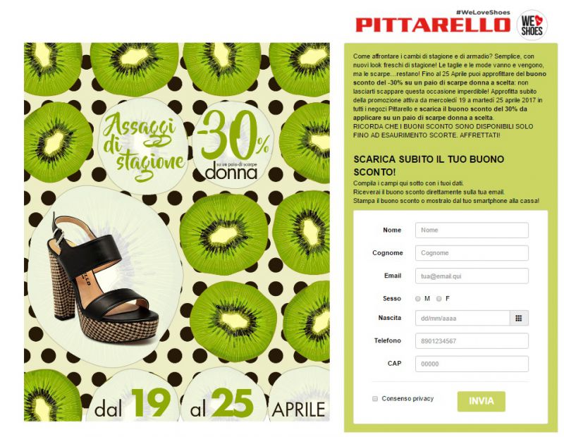 Ecco qui il nuovo Buono sconto di Pittarello per questa Primavera! Pittarello di offre un coupon sconto del 30% per farti affrontare al meglio il cambio di stagione e dell'armadio! Niente è meglio di un nuovo look fresco di stagione con un nuovo paio di scarpe a prezzo scontato. L'offerta Pittarello di Primavera è valida questa volta fino al 25 aprile. Il Coupon Pittarello del 30% è valido su un paio di scarpe donna a scelta: il buono sconto sarà scaricabile a questo indirizzo, dal 19 aprile fino a martedì 25 aprile 2017. Clicca sul link segnalato, compila il form con i tuoi dati e attendi la mail che ti confermerà il buono sconto Pittarello da utilizzare in un qualsiasi punto vendita Pittarello in Italia. Puoi scegliere di stampare il buono e presentarlo in cassa con il paio di scarpe da donna che preferisci oppure, puoi direttamente mostrarlo in cassa dal tuo smartphone senza necessità di stamparlo. Se vuoi approfittare del coupon Sconto del 30% su un paio di scarpe a scelta, affrettati a scaricare il buono. Il coupon Pittarello è infatti disponibile solo fino ad esaurimento scorte.