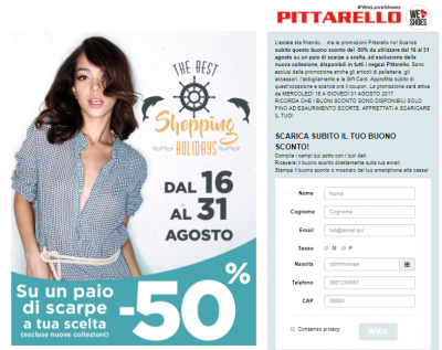 Il procedimento per scaricare il buono sconto Pittarello è sempre lo stesso: clicca sul link segnalato, compila il form con i tuoi dati e attendi la conferma nella casella di posta indicata. Una volta confermata la richiesta riceverai il tuo Buono Sconto Pittarello del 50% da utilizzare in negozio dal 16 al 31 agosto 2017 per uno sconto del 50% su un paio di scarpe a scelta direttamente in cassa. Per una scelta comoda ed ecologica, puoi scegliere di non stampare il tuo coupon: è valido anche se mostrato semplicemente in cassa dallo schermo del tuo smartphone!