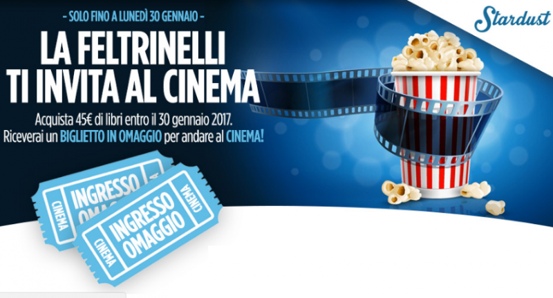 Questa volta, acquistando sul sito La Feltrinelli libri per almeno 45 euro, otterrai un biglietto omaggio per andare al cinema. L'offerta è valida dal 25 al 30 gennaio 2017. Per ogni acquisto effettuato online di almeno 45 euro, La Feltrinelli invierà un voucher digitale “Stardust 1+1”. Con questo coupon Stardust, con un ingresso a tariffa intera pagante, si ottiene un secondo ingresso in sala in omaggio. Il voucher code voucher Stardust 1+1 può essere usato per la visione di un qualsiasi spettacolo in 2D, dal lunedì al venerdì, nelle sale aderenti all'iniziativa. Restano invece escluse dalla promozione le proiezioni speciali, quelle dei weekend e quelle in 3D.
