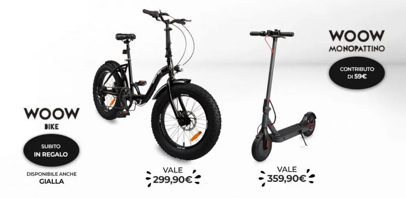 Acquistando uno dei prodotti che partecipano all'offerta (che puoi vedere qui), puoi scegliere se avere subito in regalo la WOOW Bike, oppure con un contributo di 59€ il monopattino elettrico WOOW.