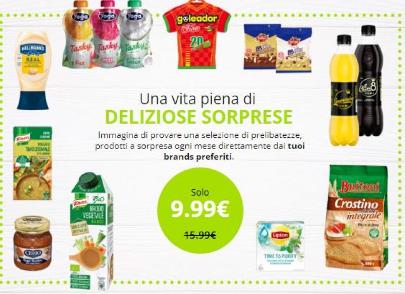 Usufruendo della promozione è possibile quindi ricevere ogni mese una food box, contenente snack dolci e salati, bibite, prodotti di gastronomia, e tanti altri articoli alimentari nuovi sul mercato. La box conterrà 10+ articoli.
