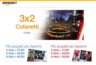 ⦁ Codice promo Amazon sui Cofanetti: la saga del Signore degli Anelli, la Collezione completa di Harry Potter, Kill Bill, Il Trono di Spade: questi sono solo alcuni dei cofanetti e delle edizioni speciali in DVD e Blu Ray che possono essere tue a prezzi scontati. Con questo codice sconto Amazon infatti se scegli almeno 3 titoli tra i cofanetti disponibili, il più economico te lo regala Amazon!
